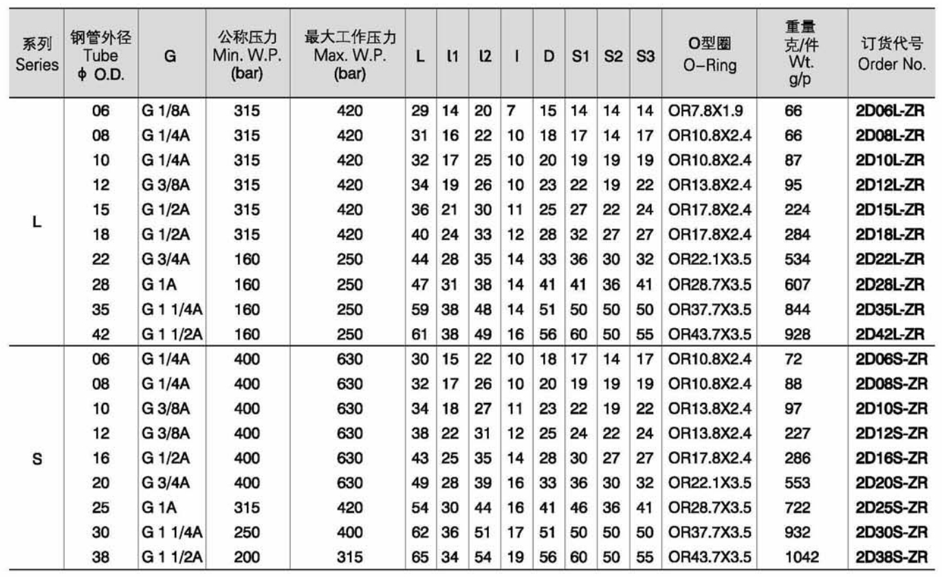 不带螺母和卡套时的订货代号示例:2D10L-ZRX